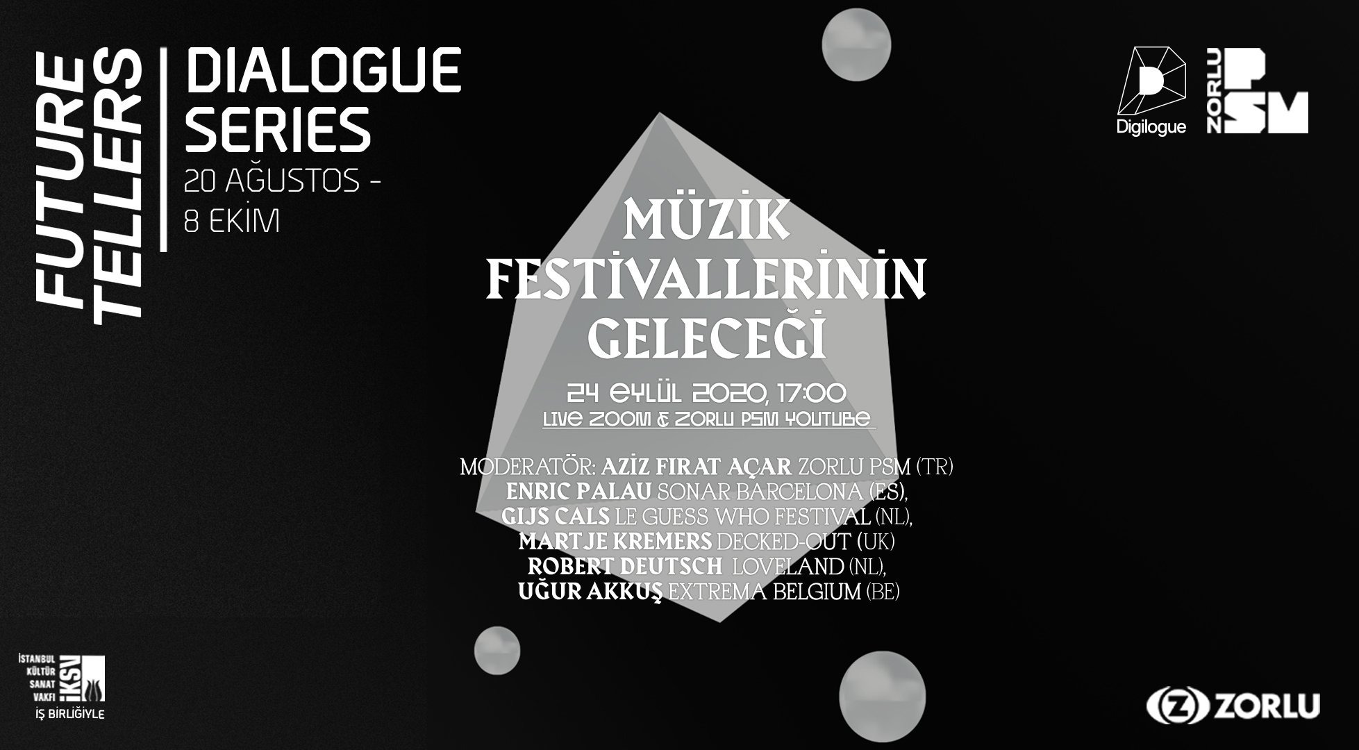 Zorlu PSM'nin düzenlediği Gelecek Anlatıcıları Webinar Serisi'nin dördüncüsü olan Geleceğin Dünyasında Müzik Festvalleri, perşembe günü Aziz Fırat Açar'ın moderatörlüğünde gerçekleşecek. Zoom ve Zorlu PSM Youtube kanalından ücretsiz olarak izlenebilecek panelin katılımcıları arasında Enric Palau, Gijs Cals ve Uğur Akkuş gibi isimler var.