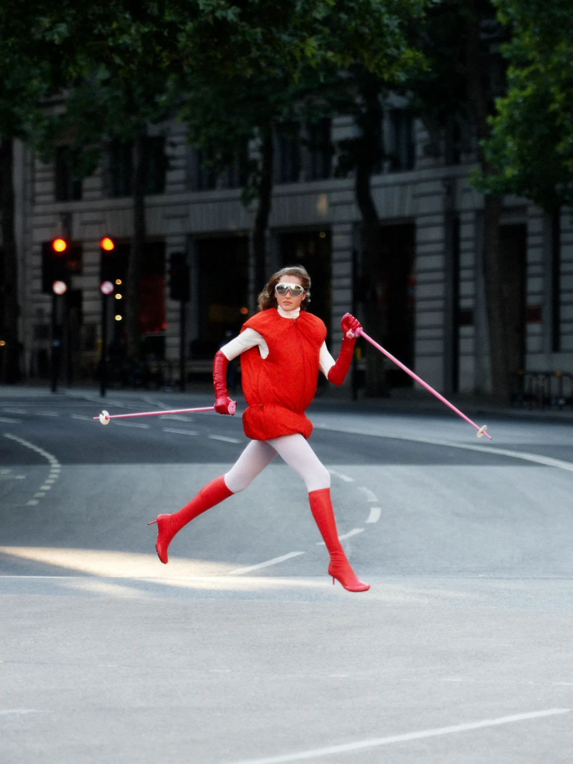 Kırmızı vurgulara sahip bu iddialı görünümde sporcu gücü, süper kahraman estetiğiyle buluşuyor. Moncler + Jil Sander imzalı puffer ceket ve deri botlar. Wolford balıkçı yaka. Paula Rowan eldivenler. Moncler güneş gözlüğü.