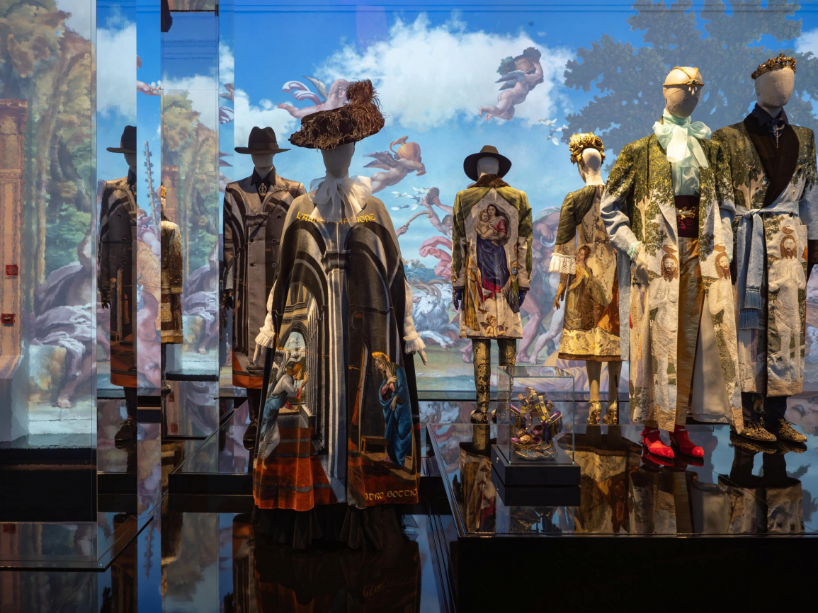 Mimari düzenlemeler tasarımcıların Botticelli, Leonardo da Vinci, Raphael, Titian, Piero della Francesca, Giorgione, Salaì, Caravaggio ve Moroni gibi sanatçılara duyduğu hayranlığı yansıtıyor; her bir giyside mimariyi anımsatan yapısal kurguları sergiliyor. İşlemeli siluetler ve göz alıcı tasarımlar sayesinde ziyaretçiler, markanın Antik Roma, mitoloji, Bizans dönemi ve her koleksiyonun etrafında örülen anlatılarla kurduğu bağlantıları keşfediyor. Tasarımcıların ilhamının merkezindeki mozaikler, markaya güçlü bir görsel imza kazandırıyor. Sergi boyunca Sicilya seramiklerinin etkisinin, teatral anlatımın ve İtalyan kültürünün önemi hissediliyor. Farklı yaratımlar ve heykelsi parçalar, markanın zanaatkarlığını ve ihtişam anlayışını kanıtlıyor.