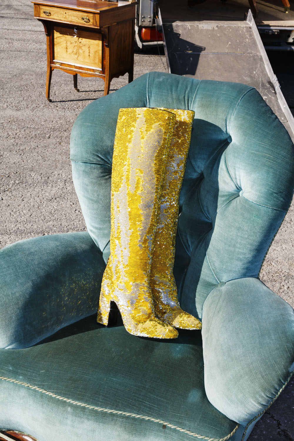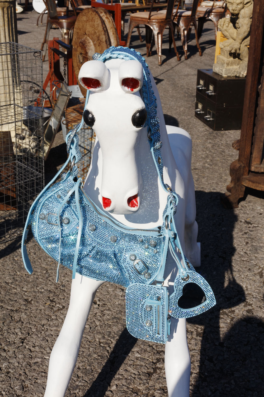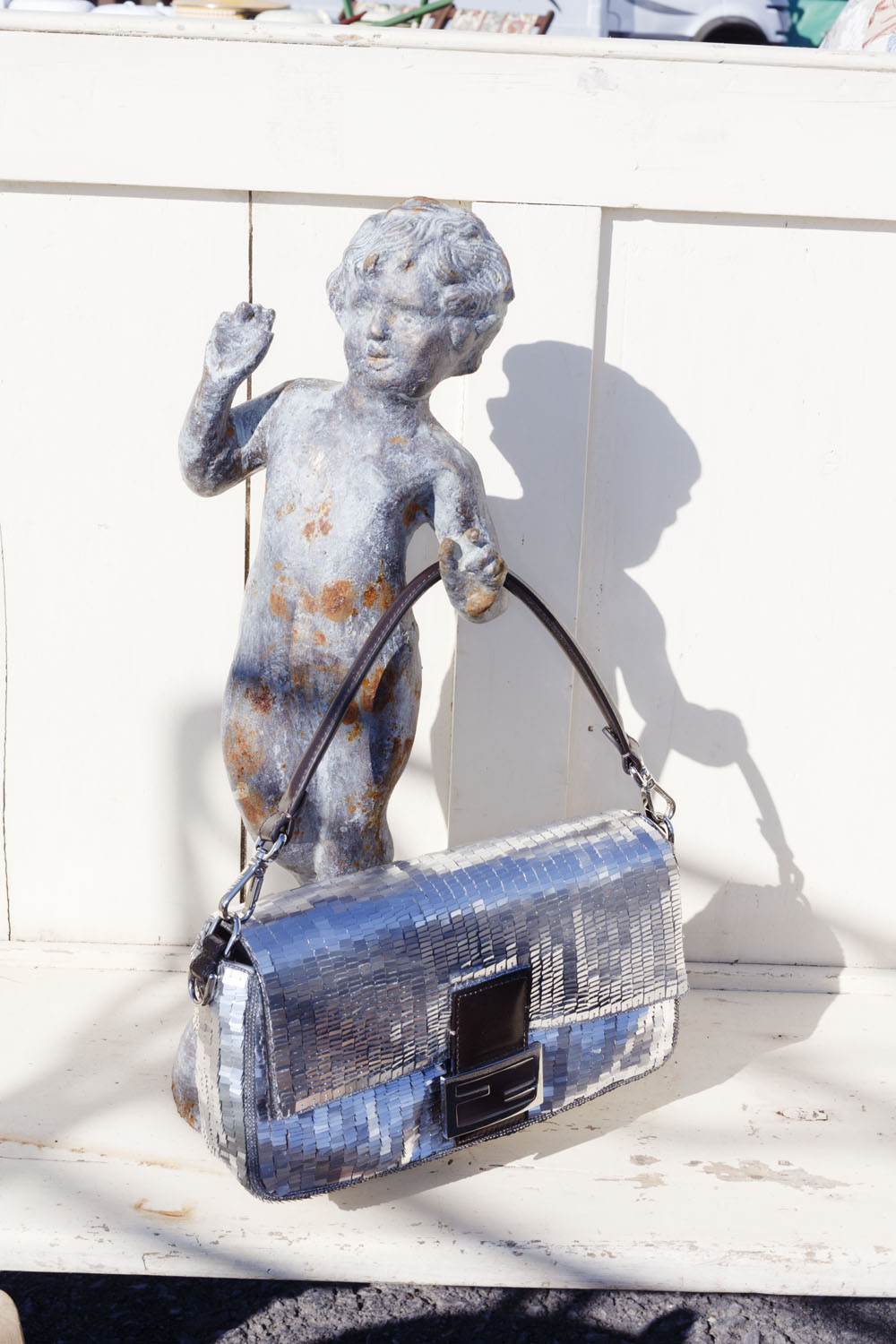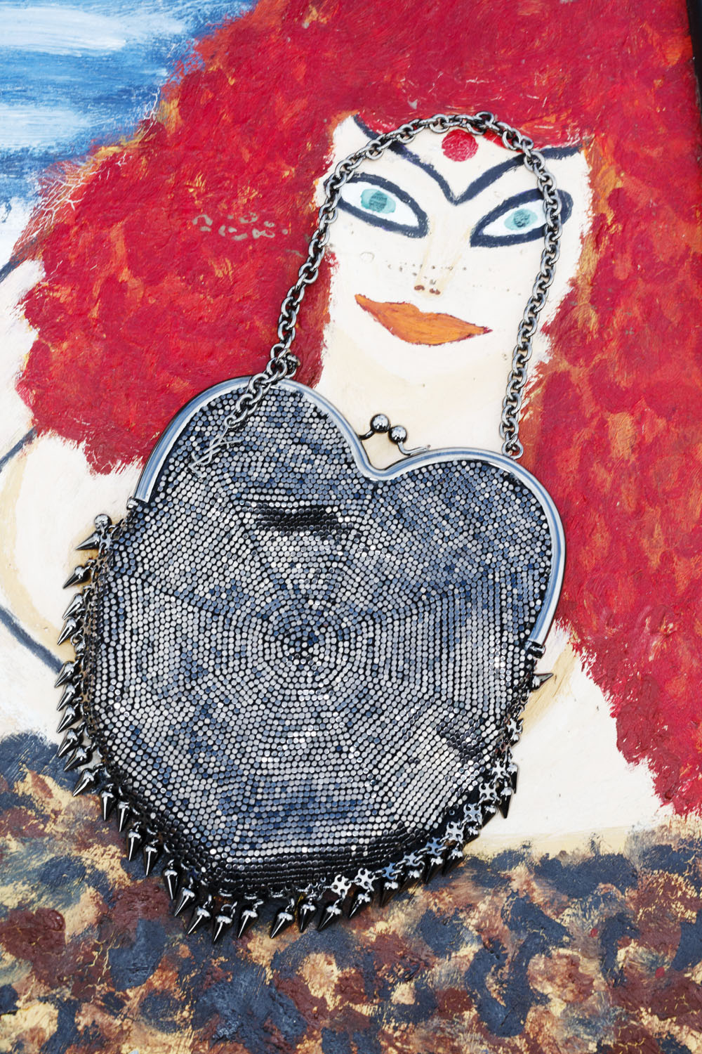 Antik fuarın başka bir köşesinde Saint Laurent by Anthony Vaccarello imzalı ışıltılı bir çanta kabarık saçlı bir portreyi tamamlıyor.