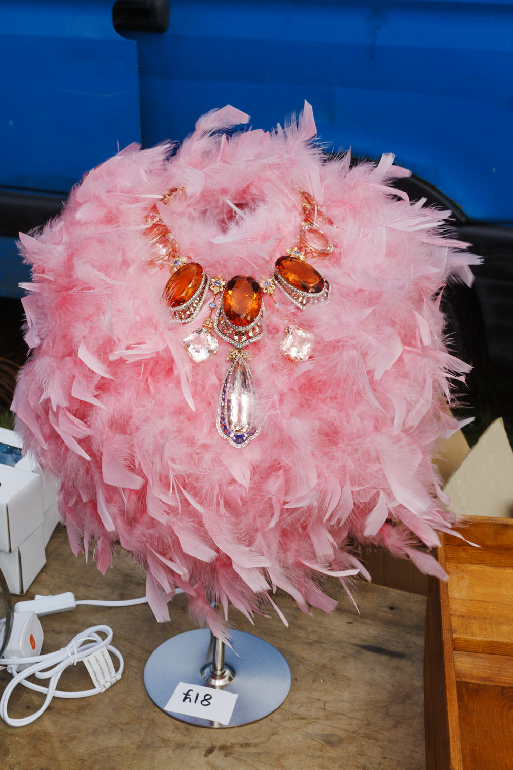 Pamuk şeker rengindeki bir tüy bulutu bile morganit, sitrin, tanzanit, mavi safir ve elmas süslemeli buDolce & Gabbana Alta Gioielleria kolyeyi gizlemeyi başaramıyor.
