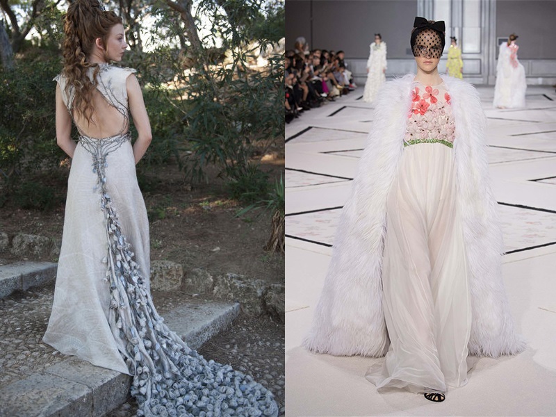 Çiçekler şövalyesinin kardeşi olmak floral desenlere sonsuz teslimiyet ve hakimiyet demek. Margaery Tyrell'ın floral gücü Giambattista Valli'yi de 2015 İlkbahar / Yaz Couture koleksiyonunda tesiri altına almış.