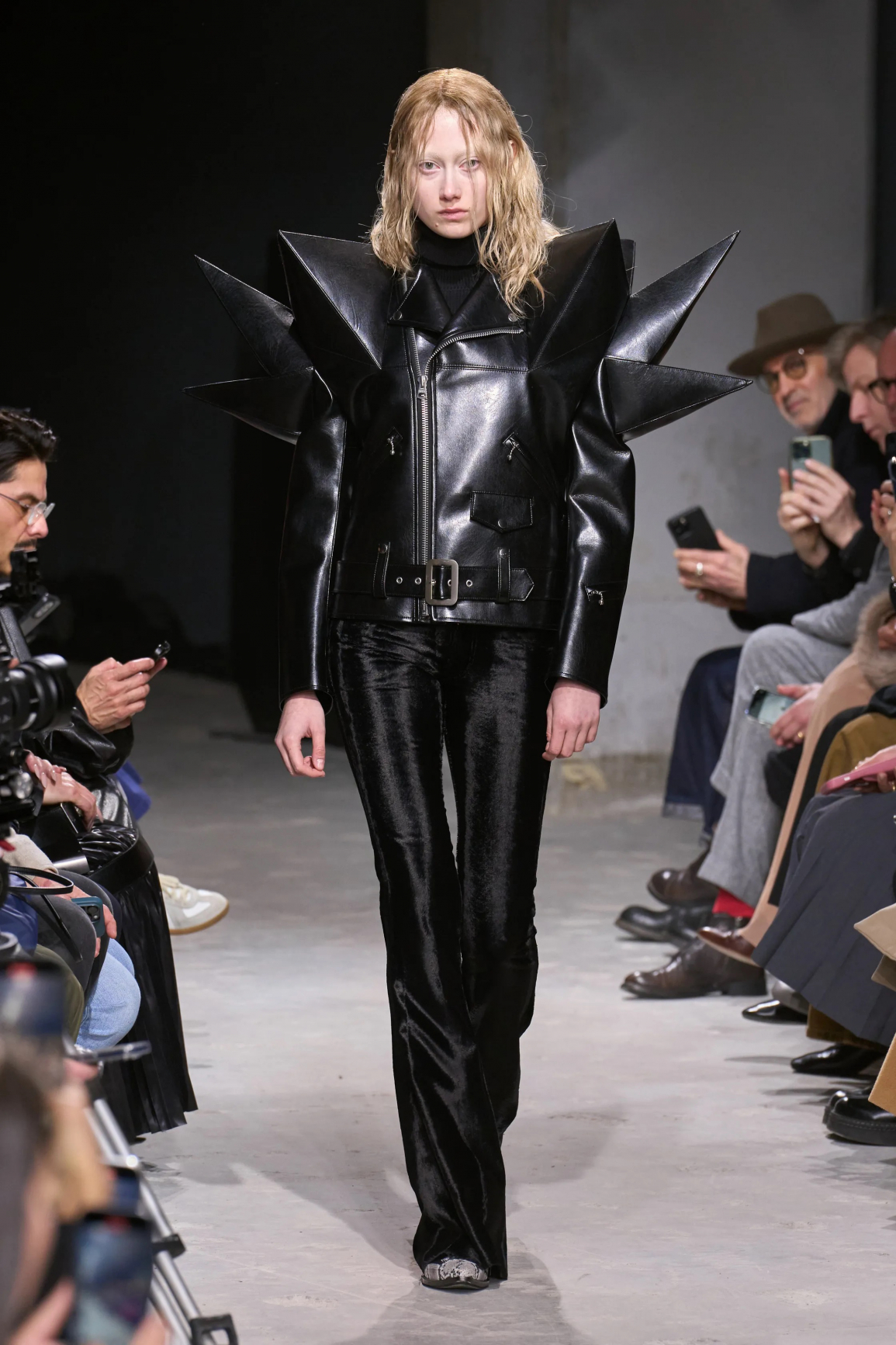 Bir süredir feminen duruşu farklı disiplinlerle tasarımlarında birleştiren Altuzarra, deri çan etek ve triko üstlere zımba ekleyerek çarpıcı bir tezatlık yakaladı. Simone Rocha ise palto ve ceketlerin üzerine metalik tokalı kemerler ekleyerek sert öğeleri ustalıkla bir arada kullandı. Bu denkleme suni kürk detaylı üstler ekleyerek punk stilinde desibelini yükseltti. Junya Watanabe, müzisyen Jimi Hendrix ilhamıyla perukvari ceketler ve şekil değiştiren elbiselerle punk enerjisini podyuma taşıdı. Tom Ford’un kreatif direktörü Haider Ackermann, işçiliği merkezine alarak gardırop temellerini punk stiline yaklaştırdı. Nitekim kaliteli bir deri tişört, düşük bel siyah kumaş pantolonla bir araya geldiğinde özgüvenli bir kontrast yakaladı. Paris Moda Haftası'nı etkisi altına alan Vaquera’da neredeyse omuzdan düşecek oversize biker ceket, hacimli bir kruvaze ceketi andıran gri midi boy elbiseyle eşleştirildi. Görünümün asıl kırılma noktası, gotik hissiyatlı dantel başlık ve burjuvazinin simgelerinden biri olan ironik şekilde büyütülmüş inci kolyeydi. Punk’ın alışılmış anti-lüks tavrına karşı lüksü tanımlayan metaforlar kullanılarak ilginç bir moda parodisi yaratıldı.