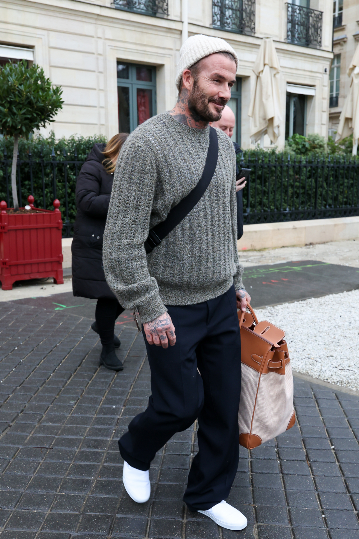 David Beckham ise lacivert pantolon, fitilli bir kazak ve bembeyaz spor ayakkabılarla daha rahat bir siluet tercih ederken, kanvas ve deriden yapılmış oversize Hermès Haut à Courroies modeliyle stilini dengeledi. Eşinin Birkin’inin yaklaşık iki katı büyüklüğündeki çantayı, bugüne dek alışık olduğumuz gibi kapalı tutmak yerine ağzı açık şekilde taşıması dikkat çekti - belli ki bu kez stil ipucu Victoria’dan gelmişti.