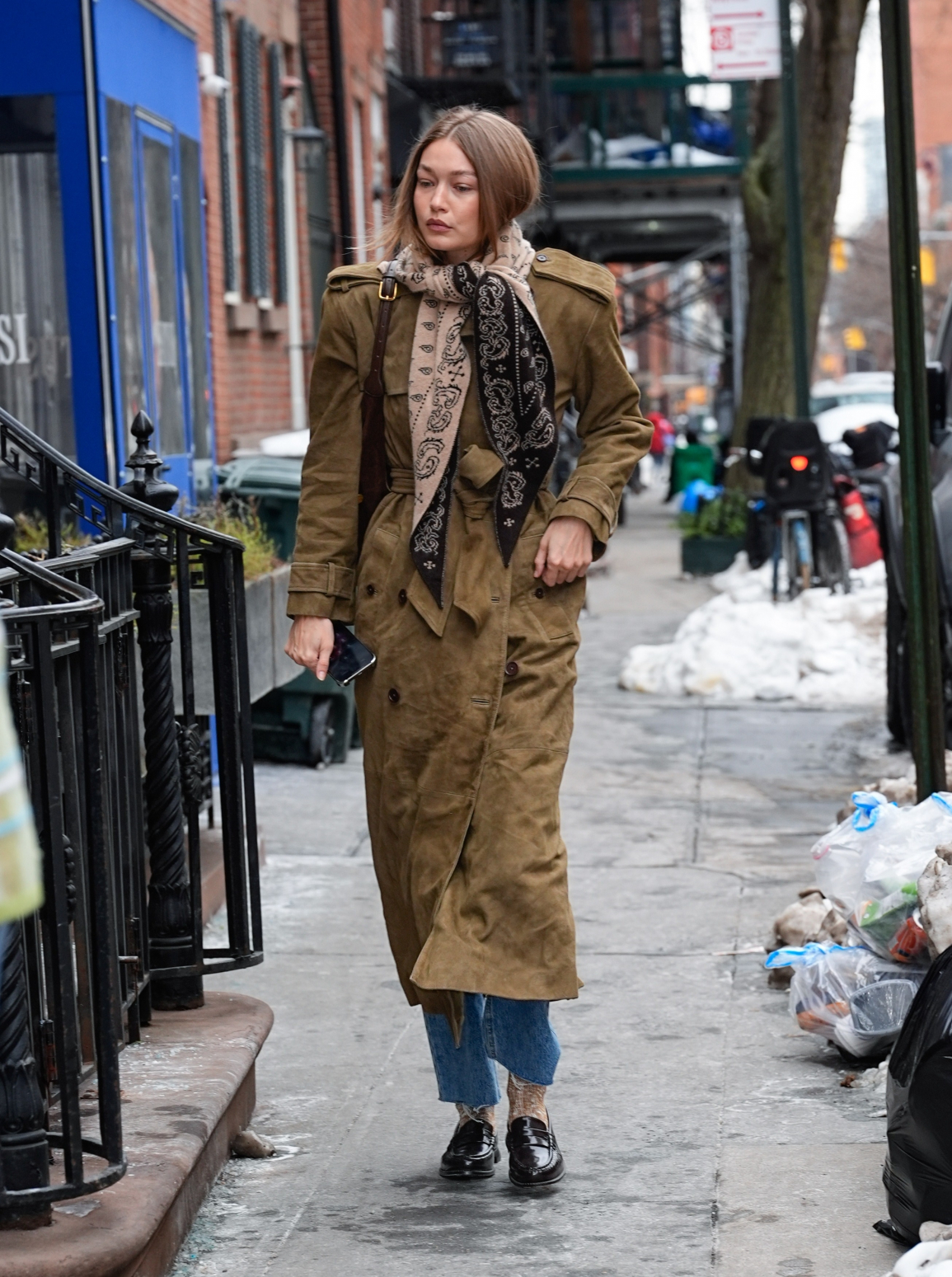 Bazen giyinirken bir moodboard’dan ilham alırsınız, bazen de o moodboard siz olursunuz. Bunun en iyi örneklerinden biri kesinlikle Gigi Hadid. Girişimci süpermodel, New York merkezli markası Guest in Residence’a ait Wild Rag adlı bir fularla New York’ta dışarı çıktı. Şal desenli bu parçayı orta ton yıkamalı jean, klasik penny loafer ayakkabılar ve oversized süet bir trençkotla kombinledi. Bu görünüm, Hadid’in modern-prep stilinin imza üniformalarından biri.
