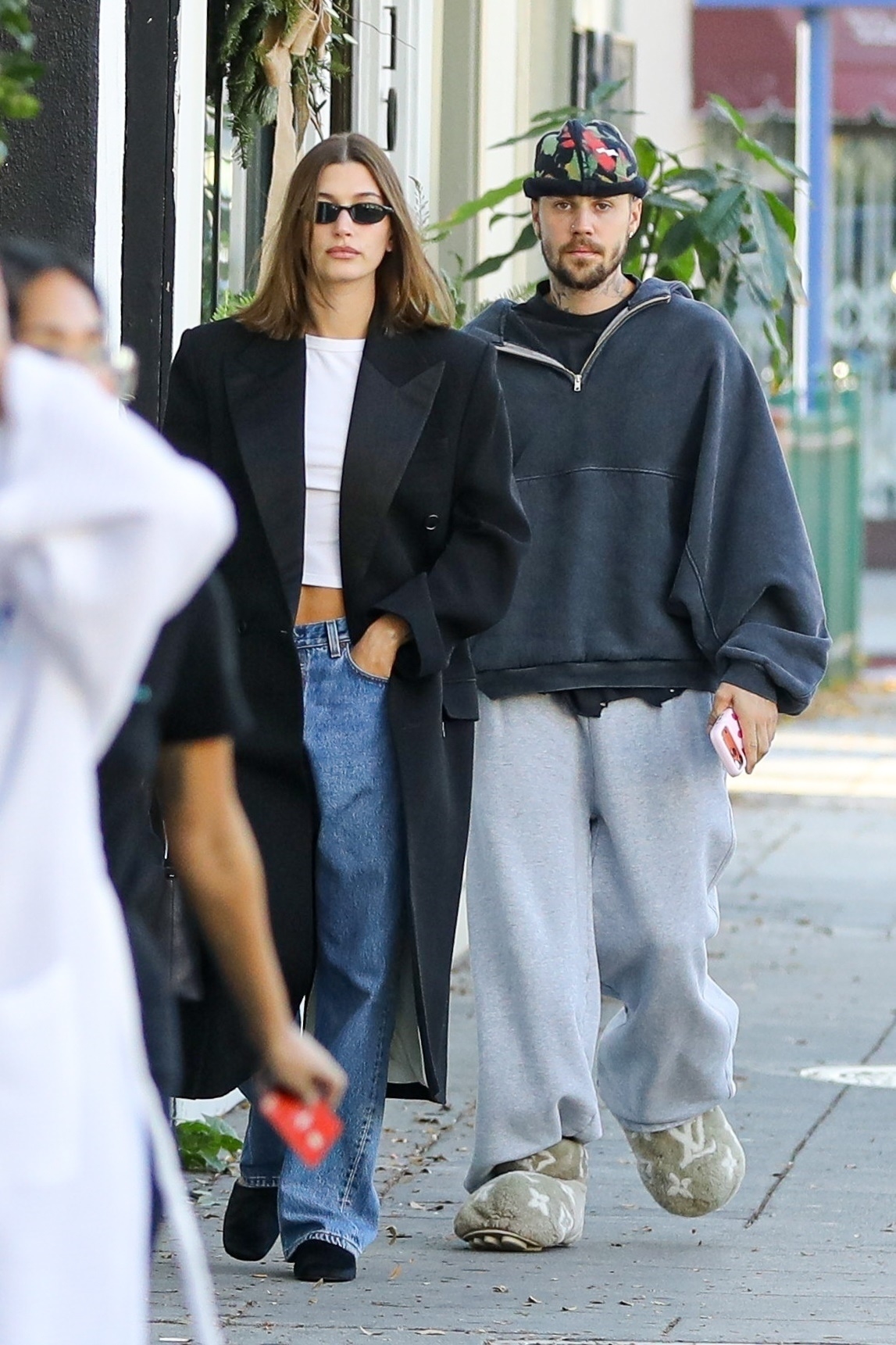 Hailey Bieber’ın jean ve beyaz tişörtle kombinlediği, neredeyse yere kadar uzanan şık siyah kabanı, hava koşullarına uygun terziliğin kusursuz bir örneğiydi.