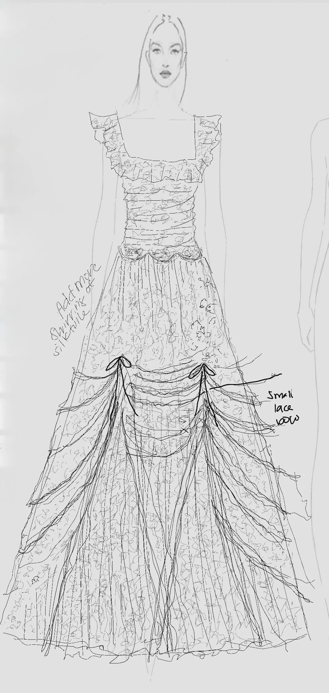 Elbette Del Rey, gelinliğin tamamen kendisine uygun olmasını istiyordu. Bu yüzden tasarımcılarla bir araya gelerek hayalindeki gelinliği nasıl şekillendireceklerini planladı. Cinq COO’su ve Macye’nin kardeşi Madelyn Wysner, “Showroom’da sabaha karşı 4’e kadar yerde oturup zamanımızı geçirdik” diyor. “Etek kısmına dantel eklemeye karar verdik ve o, üzerine kendi dokunuşunu katmak için küçük fiyonklarla bazı toplama detayları istedi. Çok Viktorya tarzındaydı.”