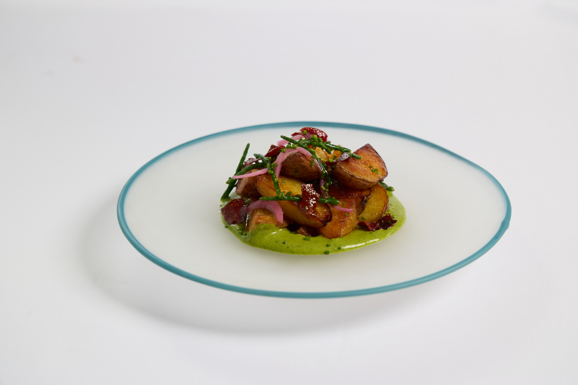 Menü yaklaşımı sade ve bilinçli: az ama özenli tabak. “Bir malzemeyi bir tabakta kullandıysam, başka bir tabakta tekrar etmiyorum” ifadesi her tabağın özgün bir hikaye sunmasını ne kadar önemsediğini gösteriyor. Papatya, kapari, diken inciri ve kayalıklarda bulunan yassıbedel gibi yerel ürünleri ekipçe topluyorlar; Akgül’ün yetiştirdiği yenilebilir çiçekler ve aromatikler tabaklara tazelik ve görsellik katıyor. Yenidünya meyvesinden yapılan vinegret ya da dut yaprağı sarması gibi sürprizler, menünün samimi yaratıcılığını ortaya koyuyor. Zeytinyağı ise mutfağın dilini belirleyen temel bir karakter.